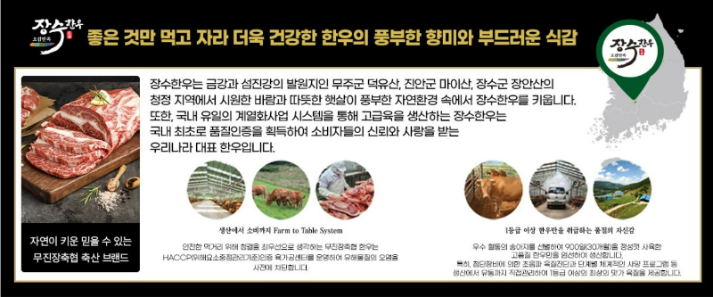 장수한우는 청정지역에서 시원한 바람과 따뜻한 햇살이 풍부한 자연환경 속에서 키운 한우로 국내 유일의 계열화 사업시스템을 통해서 고급육을 생산한다고 해요. 특히나 우수 혈통의 송아지를 선별하여 30개월을 정성껏 사육한 고품질 한우만을 엄선하여 생산한다고 하니까 참고하세요.