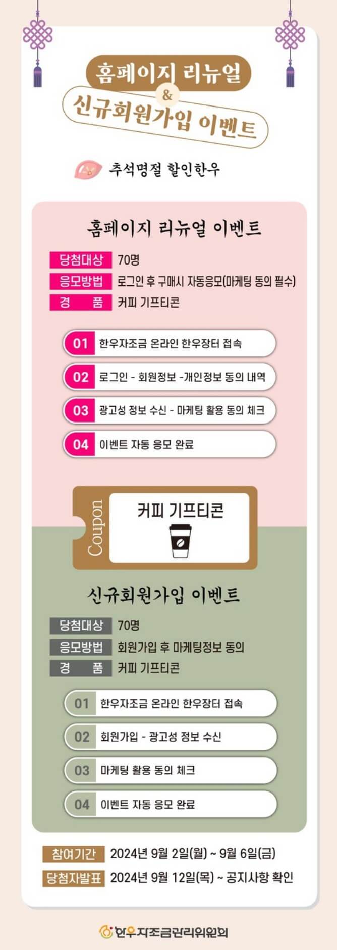 그리고 이번 행사와 맞물려 한우자조금 인스타그램을 팔로우하거나 한우자조금 온라인 장터 홈페이지에 신규가입을 하면 커피 기프티콘을 받는 이벤트도 진행 중이니까 많이 참여해 보셔도 좋을 것 같아요.
