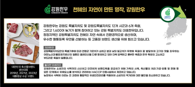 강원한우는 청정지역인 강원특별자치도 천혜의 자연 속에서 친환경적으로 생산하며 우수한 혈통등록 소만을 선발하고 있는 브랜드로 담백하고 풍부한 육즙과 한우 특유의 고소하고 부드러운 육질이 일품이에요.
