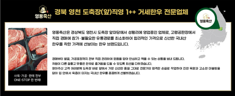 경상북도 영천시 도축 압마당에서 영업 중인 영풍축산은 직접 경매에 참가하기 때문에 불필요한 유통경로를 최소화하여 합리적인 가격으로 신선한 한우를 맛볼 수 있는 브랜드예요.