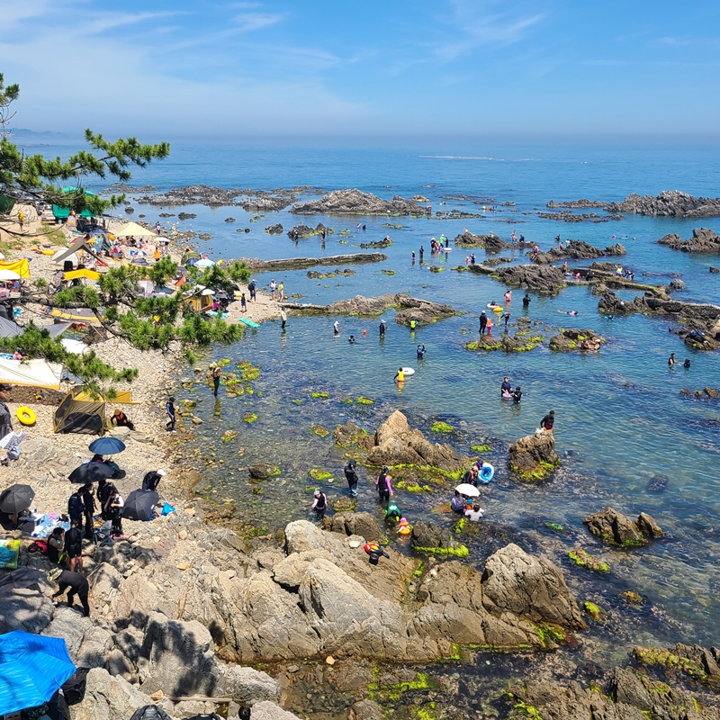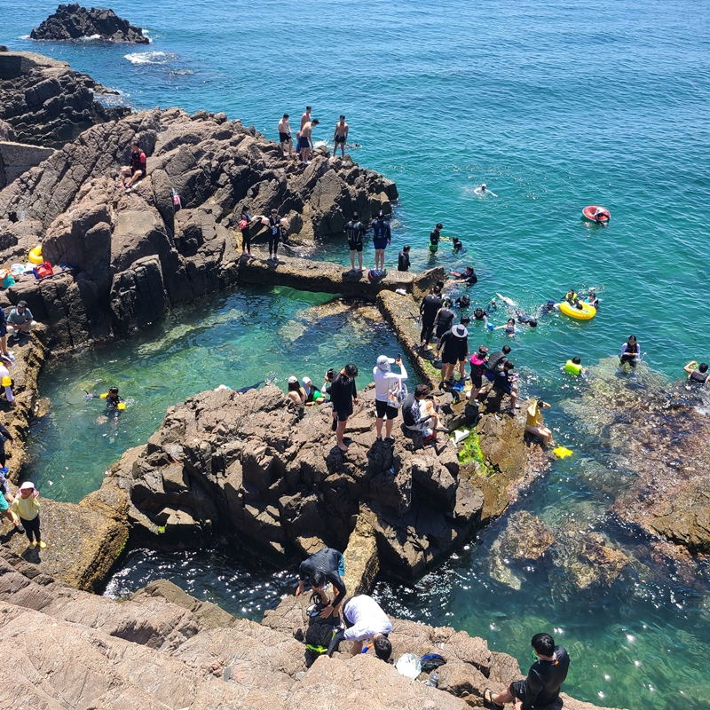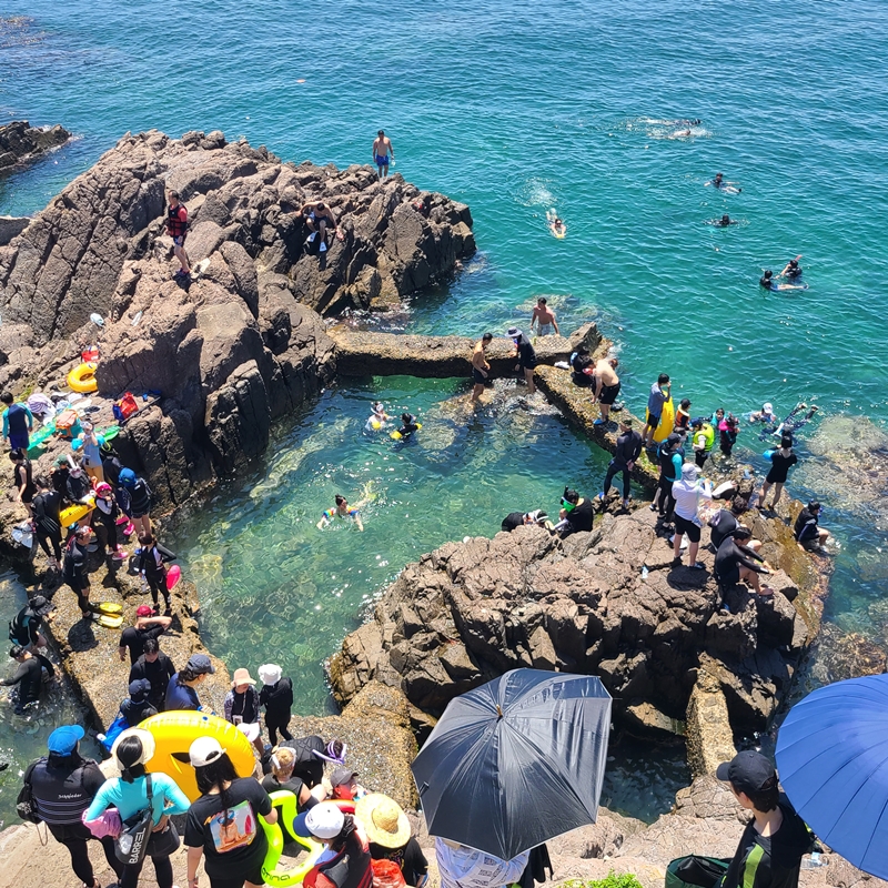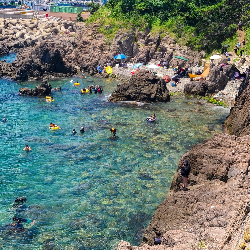 그리고 이곳이 가장 얕아 보였던 마지막 스노쿨링 스팟입니다. 선녀탕을 중심으로 양 옆은 이렇게 트여있는 해변가라고 생각하면 되는데 가장 안쪽에 있는 이곳이 제일 안전해 보이기도 했기에 어린아이들은 이곳에서 놀면 될 것 같아요.