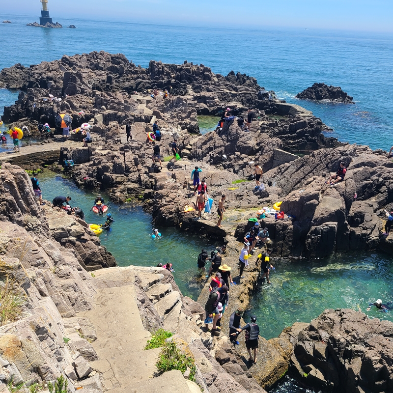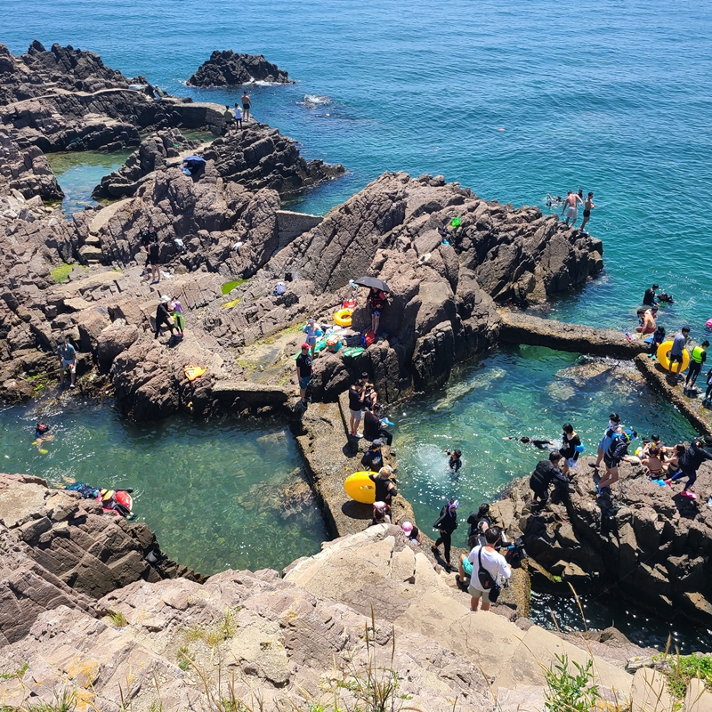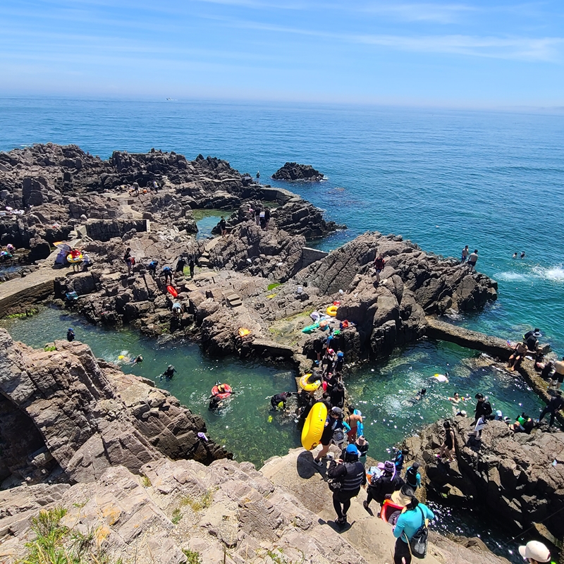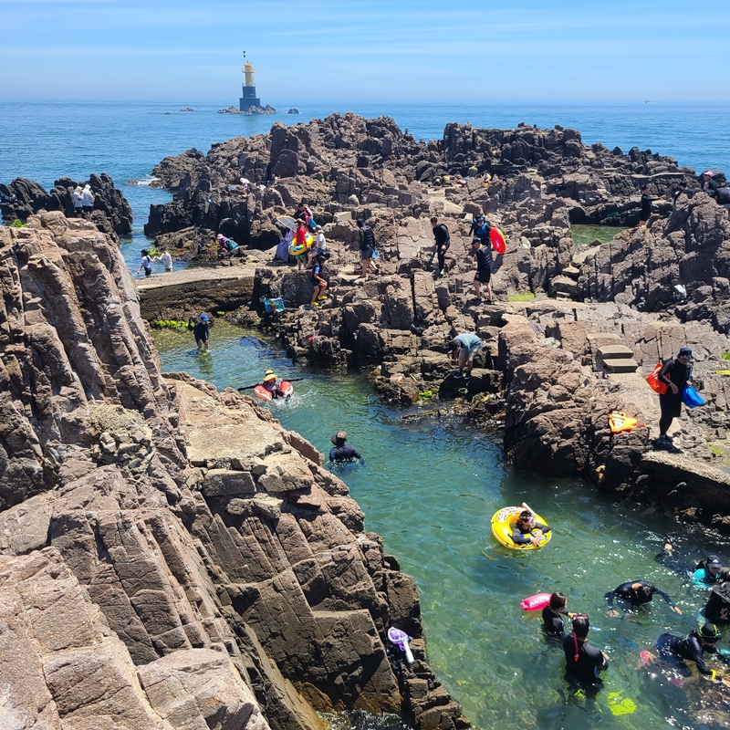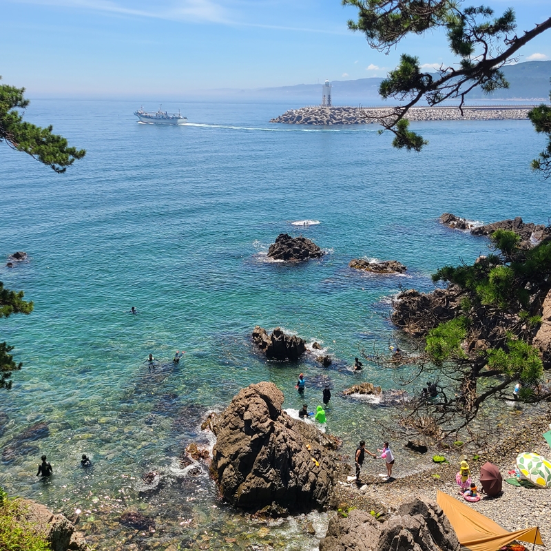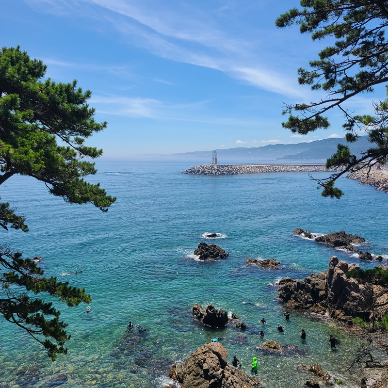 사람이 많으면 물 안쪽은 시야가 흐려지기도 하기 때문에 그게 싫다면 사람이 없는 조용한 해안가를 가는 게 더 좋을 수 있어요. 하지만 저는 삼척 장호항 보다 더 좋았던 것 같아요. 그냥 바라만 보고 있어서 좋은 느낌? 단, 구명조끼 착용을 권장하고 관리하는 장호항과 달리 송대말 등대는 별도의 제재를 하는 사람이 없기 때문에 각자 알아서 안전하게 물놀이를 즐겨야 하니 꼭! 안전에 신경 쓰면서 물놀이를 즐겨야 해요.