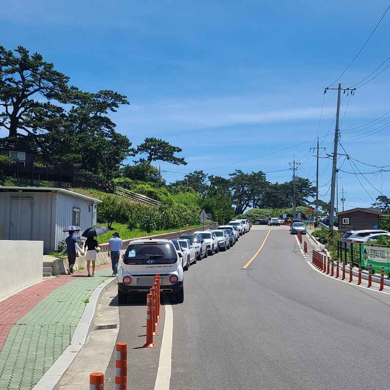 앞서 이야기했듯이 송대말 등대는 주차장이 굉장히 협소한 편인데요~ 네비에 송대말 등대를 검색하고 가면 위의 사진처럼 송대말까지 들어가는 골목이 좁고 갓길에 주차를 하다 보니 사람이 많이 몰릴 때는 좁은 도로가 정체되기도 하고, 어렵게 진입했는데 주차할 곳이 없다면 물놀이하기도 전부터 짜증이 몰려올 거예요. 그럴 때는 네비에 감포수협활어직판장을 찍고 활어직판장에 있는 공용 주차장을 이용하시는 게 좋아요. 단, 활어직판장 초입에 주차를 하기보다 안쪽으로 쭉~~ 길게 들어가면 나오는 조선소 건물 쪽에 가깝게 주차하는 것이 좋고, 송대말등대와 아주 가깝게 위치해 있는 갓길이 아니면 어디에 주차를 하더라도 조금은 걸어야 합니다.