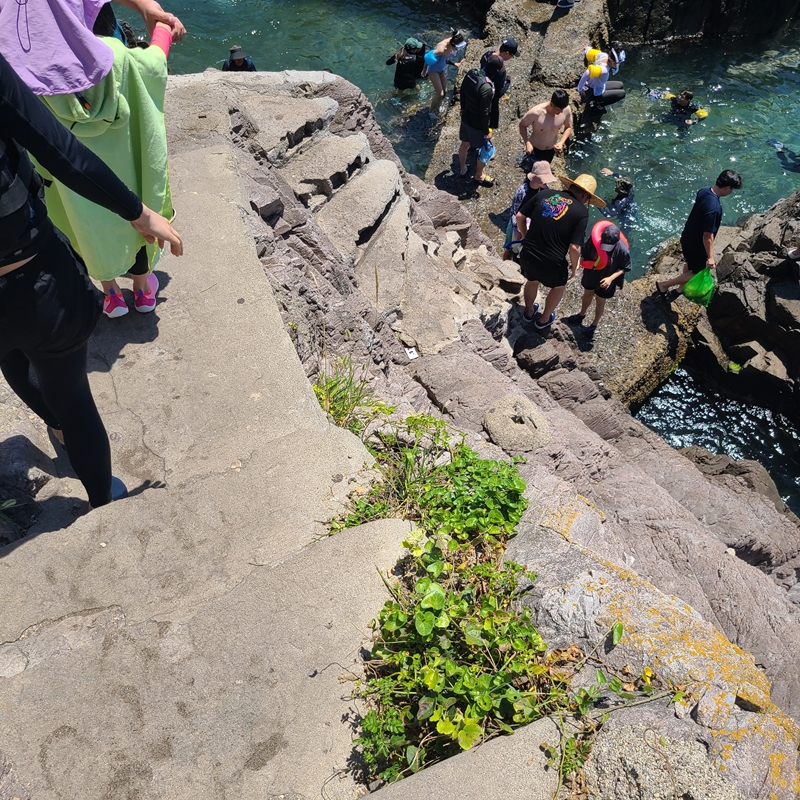 그런데 이 두번째 스팟은 내려가는 길이 굉장히 험합니다. 돌계단이 있기는 했지만 폭이 좁은 편이고 아래로 내려갈수록 더 험해서 정말 조심해서 내려가야 해요. 특히, 아이들 같은 경우에는 부모님이 더욱 신경 써야 하는데요~ 아이가 내려가다가 무서워서 도중에 멈춰버리니까 내려가려는 사람들이 정체되기도 했었는데 아이가 많이 어리거나 너무 무서워하면 양 옆쪽의 스노쿨링 스팟을 이용하시면 좋을것 같아요. 그리고 모래사장이 아닌 돌 바닥이기 때문에 꼭 아쿠아슈즈, 샌들, 운동화중 뭐라도 신으세요.