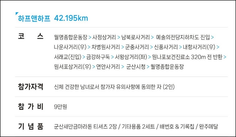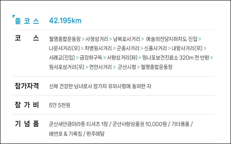 지금까지 군산 새만금 마라톤 대회 신청 접수 참가비에 대해 정리해 봤는데요~ 이번 마라톤 대회에 참가하는 분들은 마라톤 대회뿐만 아니라 군산의 맛집, 문화유적, 자연경관까지 즐기며 여행을 함께 즐길 수 있으니까 많이 참여해 보시면 좋을 것 같아요.