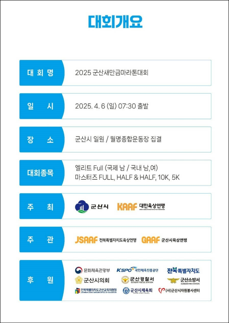 군산시의 대표 스포츠 축제인 2025 군산 새만금 마라톤 대회가 4월 6일에 개최돼요. 이는 매년 전북 군산시에서 열리는 대한민국 대표 마라톤 대회 중 하나로 국내외 러너들에게 사랑받는 대규모 마라톤 대회이기도 한데요~ 지금부터 군산 마라톤 대회 신청 접수 방법과 참가비에 대해서 정리해 드릴게요.