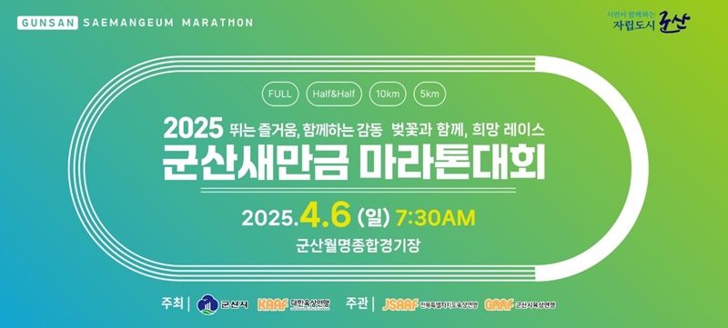 25년 4월 6일(일) 오전 7시 30분 군산 월명종합경기장에서 시작되는 새만금 마라톤 대회는 매년 전북 군산시에서 열리는 대규모 마라톤 대회 중 하나예요. 이 대회는 매년 벚꽃시즌에 진행되기 때문에 바람에 흩날리는 벚꽃과 새만금 간척지의 아름다운 풍경을 함께 즐길 수 있는 마라톤 대회이이도 해요.