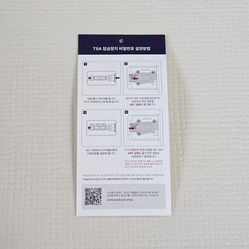 비밀번호 설정하는 방법은 안내문으로 제공하고 있기 때문에 그대로 따라 하면 되고, 혹시나 안내문을 분실했을 경우에는 캐리어를 열어서 뒷면에 있는 버튼(?)을 SET 방향에 맞춰놓은 후 비밀번호를 설정하고 다시 OFF로 맞춰놓으면 돼요.