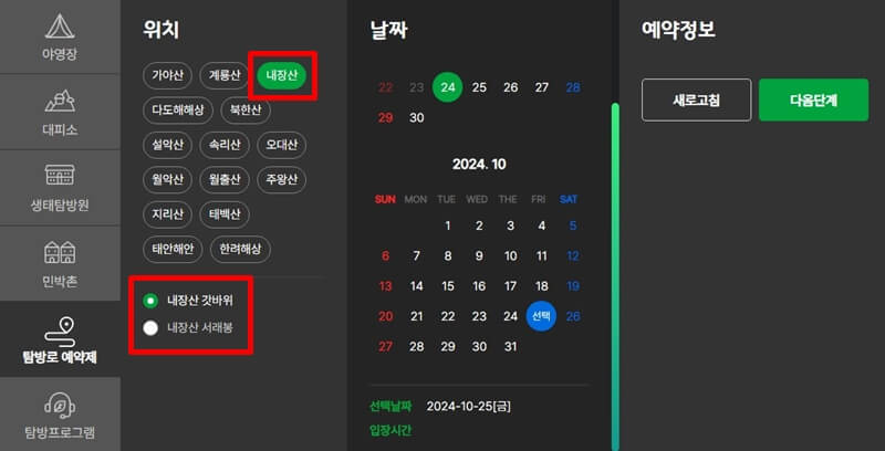 내장산 국립공원 예약 방법은 국립공원공단 예약시스템에 접속해서 내장산 선택 > 내장산 서래봉에 체크 > 날짜 선택 후 예약을 진행하면 돼요.