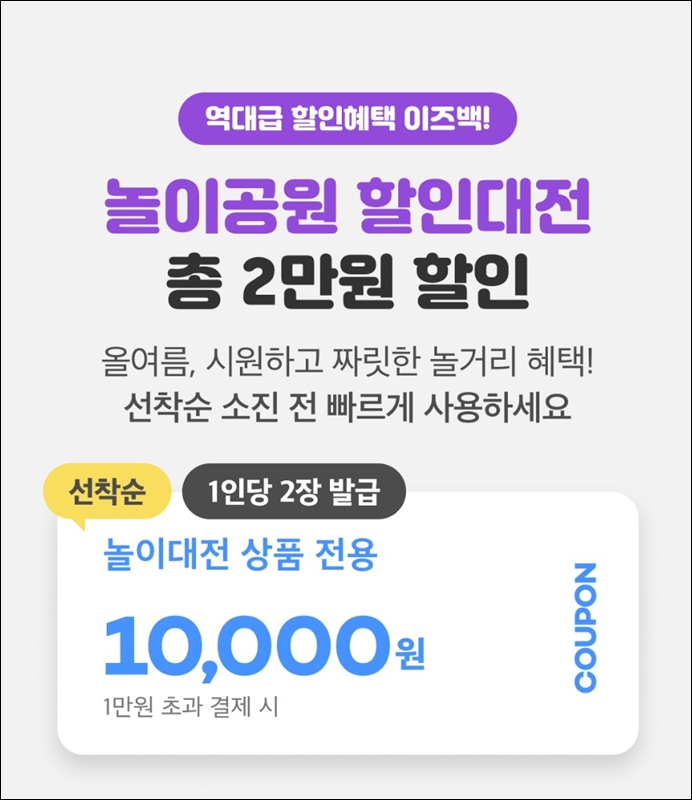 • 놀이공원 할인쿠폰 총 2만 원 제공 (1인당 1만 원 쿠폰 2장 발급)