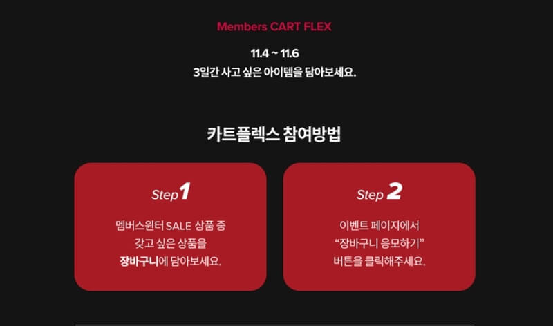 이번 뉴발란스 블랙프라이데이에서는 다양한 이벤트도 진행 중인데요~ 멤버스위크 세일 상품중에서 갖고 싶은 상품을 장바구니에 담은 후 이벤트 페이지에서 장바구니 응모하기 버튼을 클릭하면 추첨을 통해서 쇼핑지원금 15,000 마일리지를 제공한다고 해요.