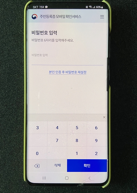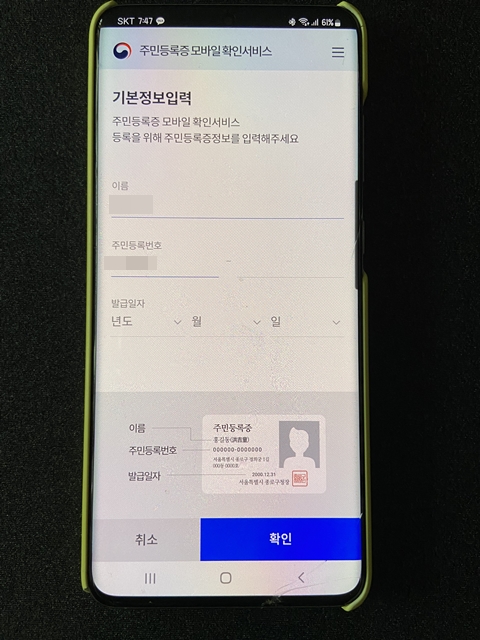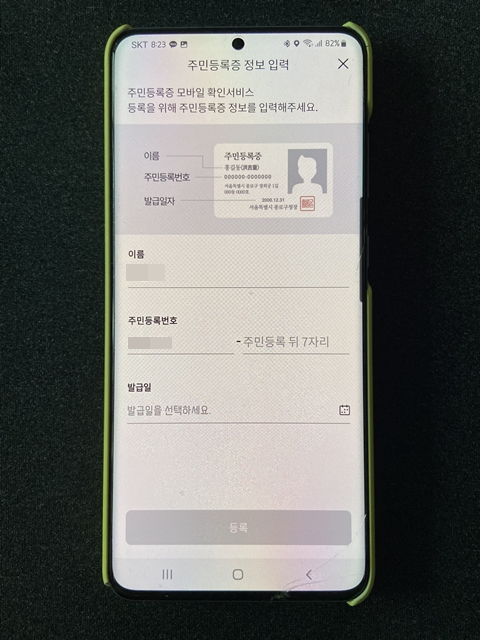 확인 서비스를 등록하겠냐는 물음에 등록을 누르고 앞서 정부24 어플에서 했던 방법과 같은 방법으로 이름, 주민등록번호, 발급일을 정확하게 입력해줍니다.