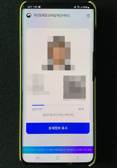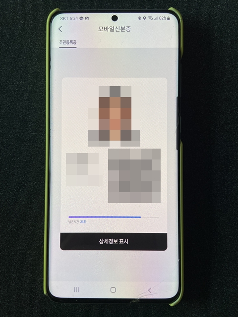 모든 정보를 입력하면 신분증 대용으로 사용할수있는 정보들이 나오는데요~ 여기서 상세정보표시를 누르고 앞서 설정해놓은 비밀번호를 누르면 주민번호 모든 자리와 상세 주소지를 확인할 수 있습니다.