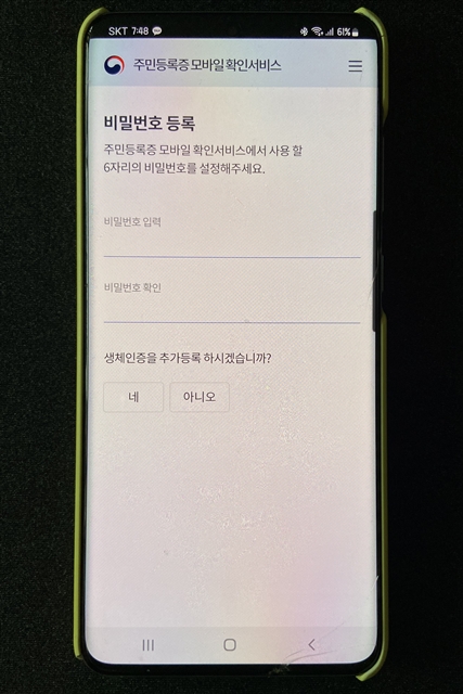 다음 단계에는 실물 신분증에 적혀있는 기본정보를 입력해야 하는데요~ PASS 인증을 거치면 이름과 주민번호 앞자리는 자동 등록이 되니 주민번호 뒷자리와 신분증에 적혀있는 발급일자를 정확하게 입력해줍니다. 이후 주민등록증 모바일 확인 서비스에서 사용할 6자리 비밀번호를 설정해주고, 생체인증을 추가 등록하겠냐는 질문에는 아니오를 눌러줍니다. < 생체인증 추가 등록은 해도 상관은 없어요. >