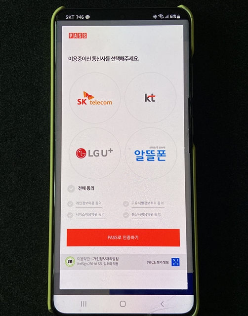 모든 준비가 끝난후 확인 서비스 약관에 동의하고 이용 중인 통신사를 선택해서 PASS로 휴대폰 인증을 진행해야 합니다. 그리고 위의 이미지에 보이는 것처럼 알뜰폰도 정상적으로 등록이 가능하고, 만약 PASS 인증서가 없다면 안내에 따라서 PASS 인증서를 먼저 발급받고 진행해주세요.