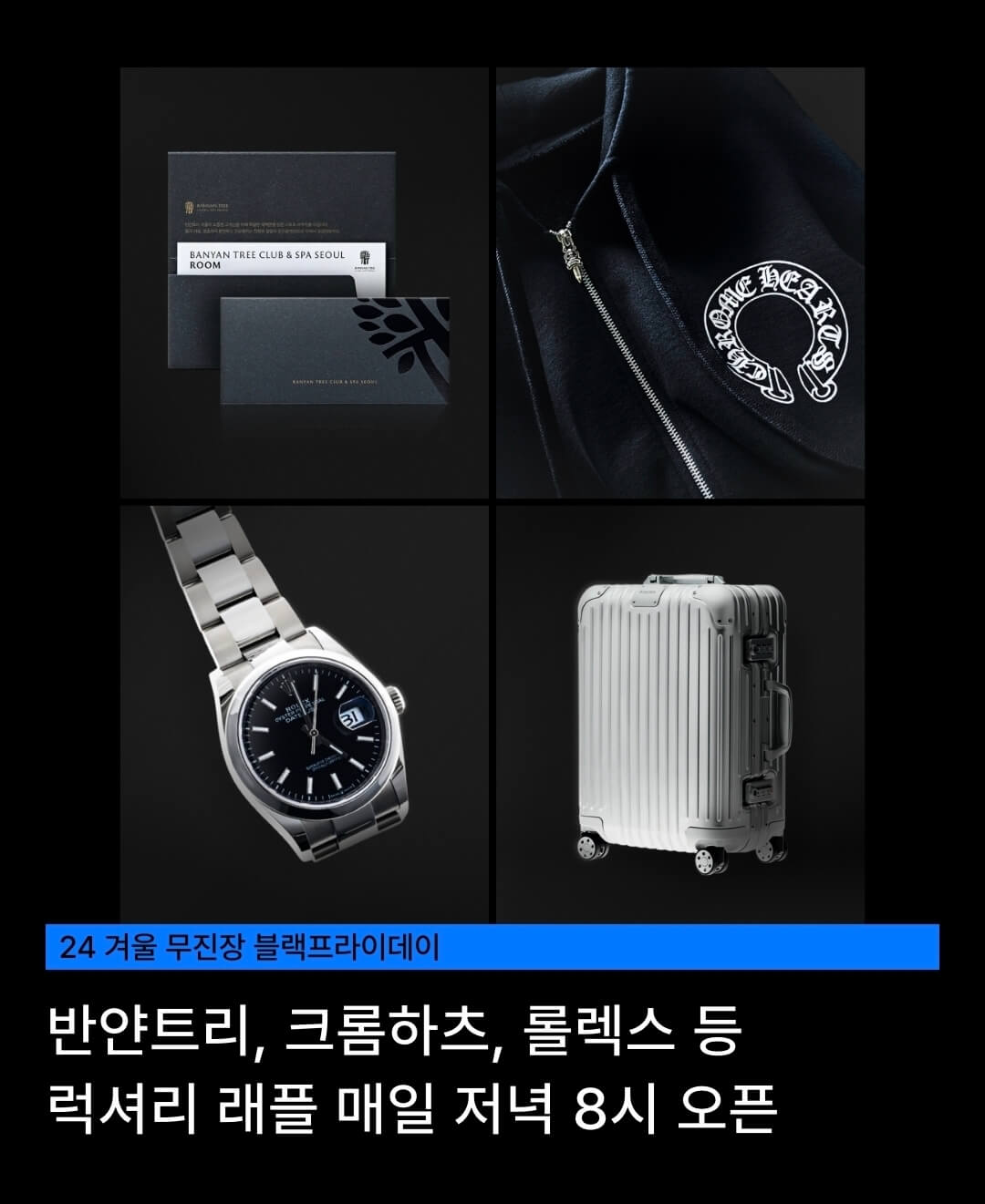 블랙프라이데이하면 빠질수 없는 게 다양한 이벤트잖아요? 무신사 블랙 프라이데이 2024에서는 까르띠에부터 롤렉스까지 매일 바뀌는 1,000원 럭셔리 래플도 진행하니까 시간이 맞으면 한 번씩 참여해 봐도 좋을 것 같아요.