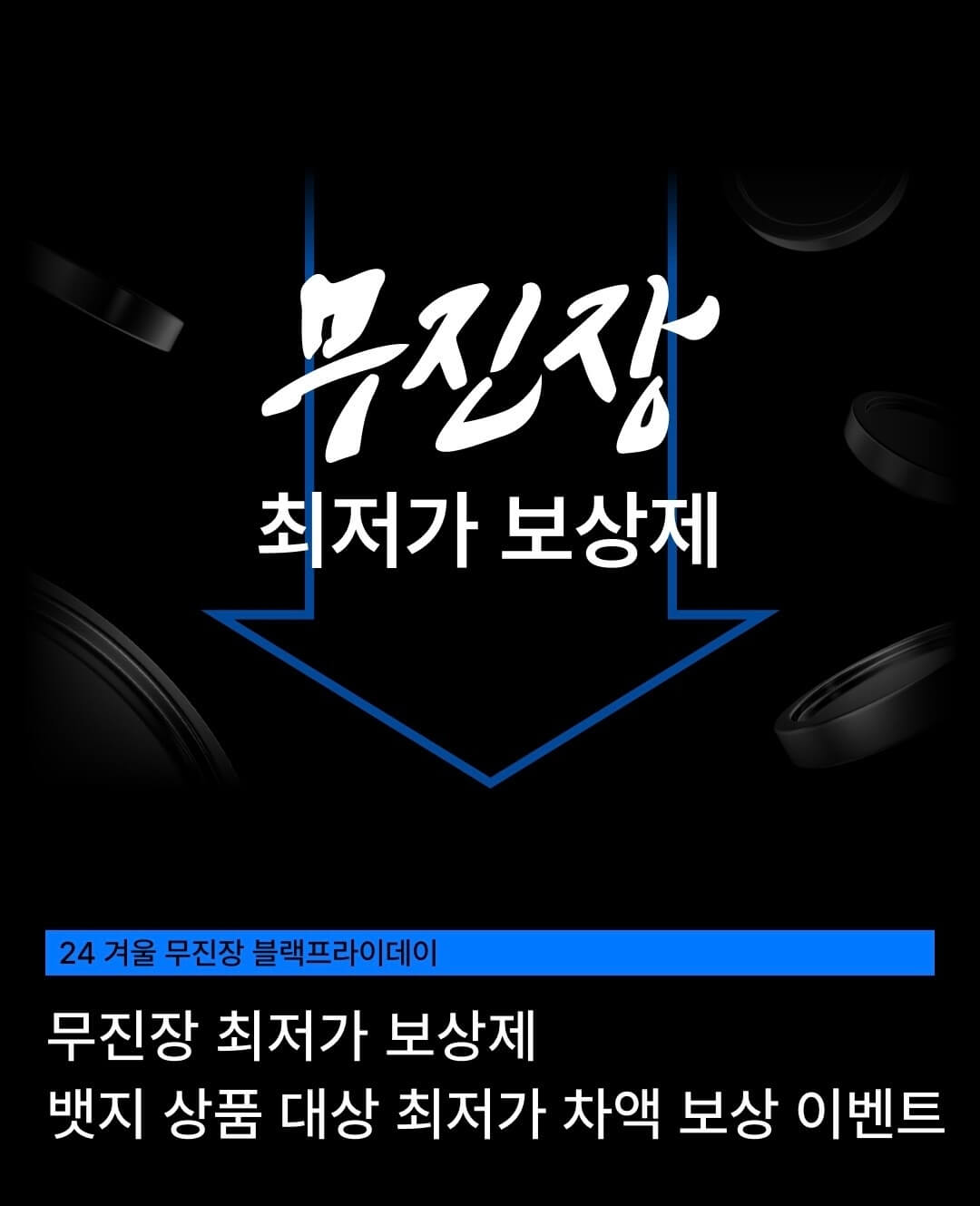 이번 무신사 블랙 프라이데이 2024 무진장 행사 기간동안에는 무진장 뱃지가 적용된 상품들을 대상으로 최저가 차액 보상 이벤트를 진행하는데요~ 무진장이라는 뱃지가 있는 상품을 결제한 내역 및 타 플랫폼과 비교한 내역을 제출하면 차액을 적립금으로 보상한다고 해요.