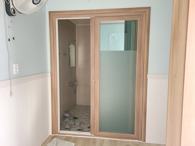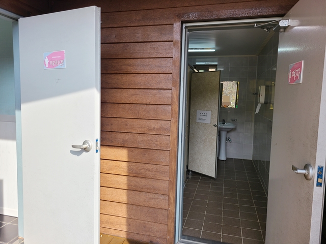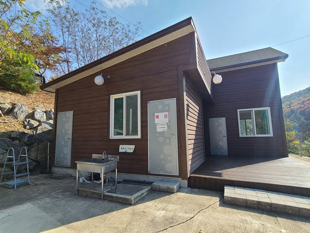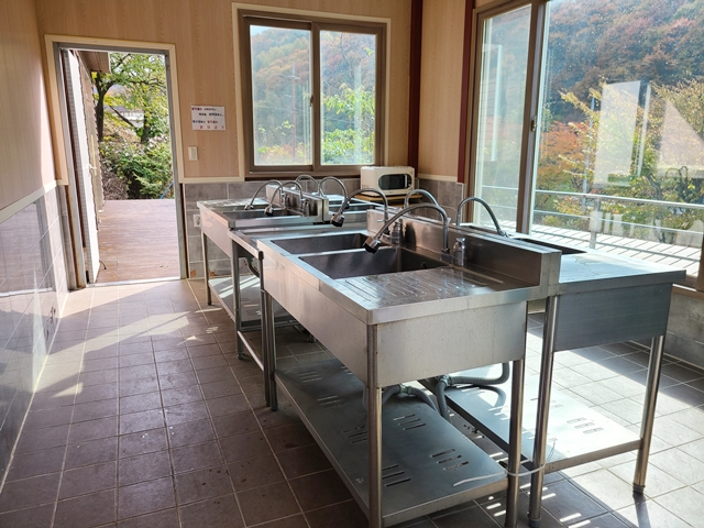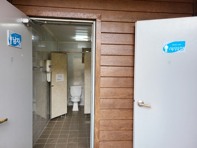 이곳이 바로 본관 매점건물에 자리 잡고 있는 부대시설로 각각의 사이트에 자리 잡고 있는 부대시설보다는 훨씬 크고 세면대가 놓여있는 화장실에는 휴지도 구비되어있었으며 전자레인지도 이곳 개수대가 놓여있는 곳에서 사용하면 됩니다. 그리고 샤워실에는 3개의 샤워기가 놓여있었어요. ( 물이 나오는 모든 부대시설들은 뜨거운 물이 굉장히 잘 나옵니다. )