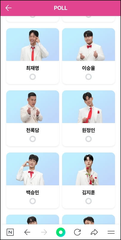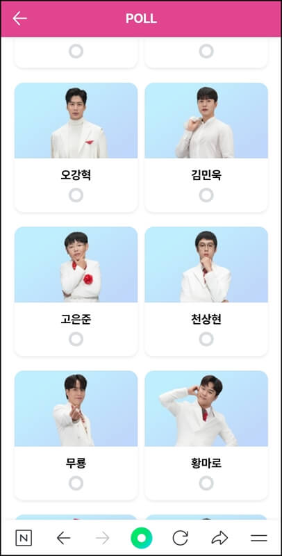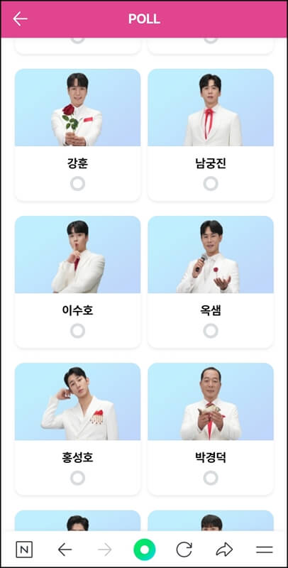 강훈, 남궁진, 이수호, 옥샘, 홍성호, 박경덕, 오강혁, 김민욱, 고은준, 천상현, 무룡, 황마로, 김홍남, 고정우, 박광현, 김지민, 이지훈, 춘길 등 총 54명이 투표 명단에 올라가 있어요. 현역가왕 남자 편보다 훨씬 많은 숫자 중에서 단 7명만 선택하여 투표해야 하니 선택장애가 올 수밖에 없겠더라고요.