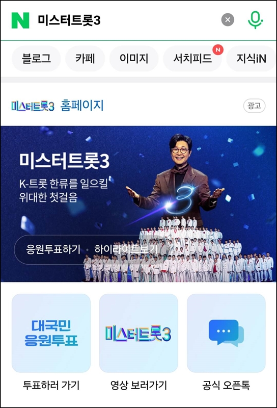 예전에는 카카오뷰로 접속하여 투표를 하거나 별도의 앱을 설치해서 투표해야 했던 방법과 달리 미스터트롯3 투표 방법은 꽤 단순해졌어요. 네이버 아이디만 있다면 대국민 응원투표에 바로 참여할 수 있는데 핸드폰 또는 컴퓨터에서 네이버로 들어가서 검색창에 미스터트롯3만 검색하면 대국민 응원투표를 할 수 있어요.