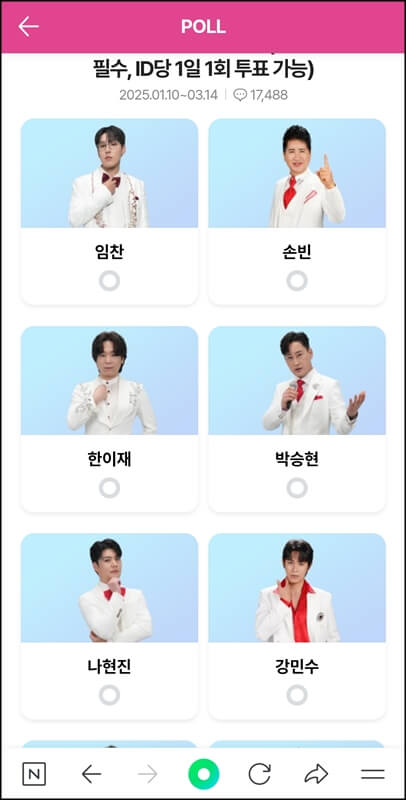 1월 10일부터 시작되었던 미스터트롯3 투표하기는 3월 14일까지 진행되고 매일 총 7팀을 선택하여 투표할 수 있어요. 하나의 ID당 1일 1회 투표가 가능하니까 많이 참여해 보면 좋을 것 같아요.