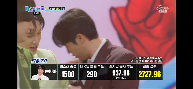 최종 점수에서 2456.76점을 받은 천록담이 최종 3위 / 최종 점수에서 2727.96점을 받은 손빈아가 최종 2위 / 최종 점수에서 2990.00점을 받은 김용빈이 최종 1위로 등극해 새로운 진이 되었어요.