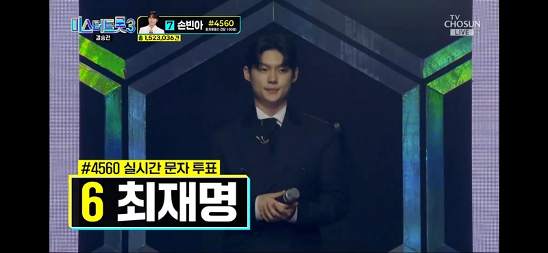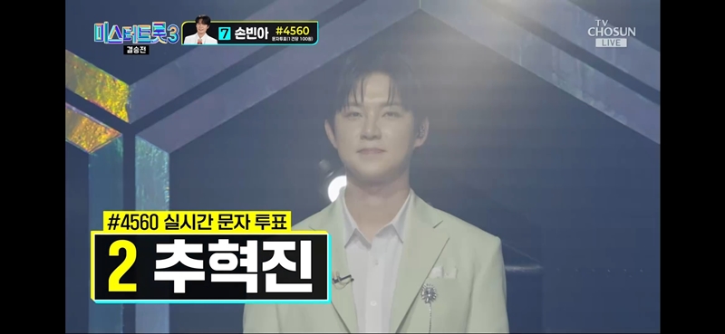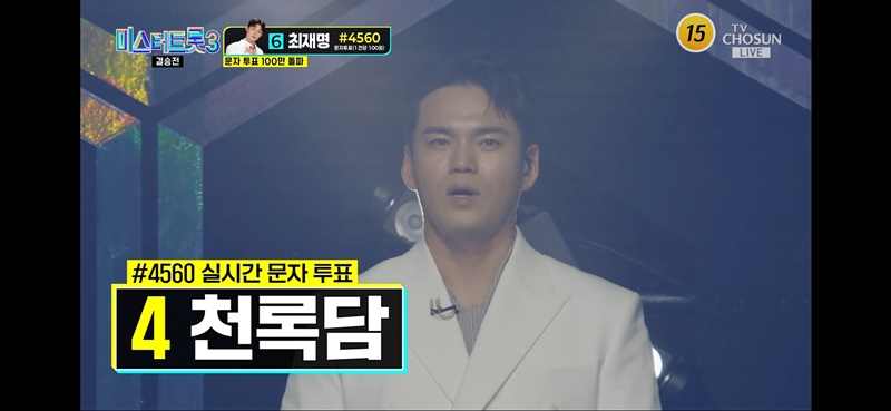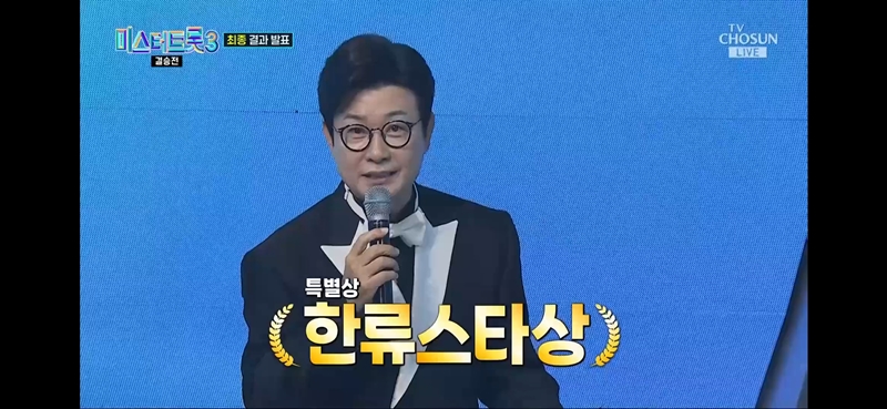 한류스타상이 공개되고 이어서 최종 미스터 트롯3 순위 결과가 공개 되었는데요~ 실시간 문자투표 점수까지 포함한 최종 순위는 7위 추혁진(총 1967.59점) / 6위 남승민(총 2165.48점) / 5위 최재명(2176.95점) / 4위 춘길(2201.87점) 순으로 이름을 올렸고,