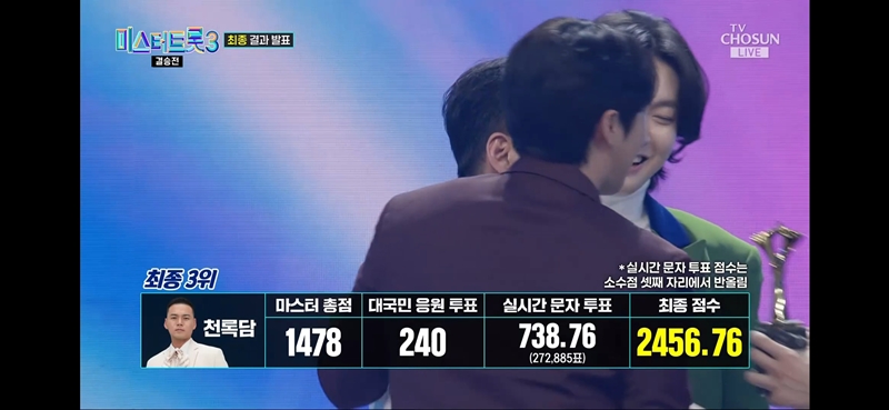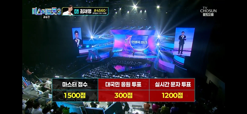 미스터 트롯3 순위 점수는 마스터 점수 1500점, 대국민 응원투표 점수 300점, 실시간 문자 투표 점수 1200점 등 총 3,000점 만점으로 진행되었는데요~ 대국민 응원투표 점수와 실시간 문자투표 점수만으로도 1500점이기 때문에 결국 최후의 1인은 여러분들 손에 달린거였어요. 그래서 저는 이때부터 누가 왕관을 차지할지 예상이 되더라고요.