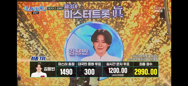 미스터 트롯3 순위 결과에서 최종 1위를 차지한 김용빈은 실시간 문자투표에서 443.256표를 획득하며 득표율에서 무려 27.01%를 기록했는데요~ 그 결과 최종 미스터 트롯3 순위에서 1위를 차지했고, 임영웅과 안성훈에 이어 3대 眞 왕관을 쓰게 됐어요.