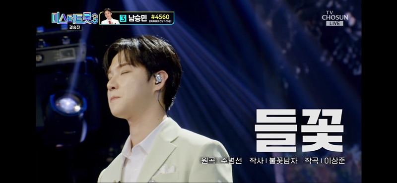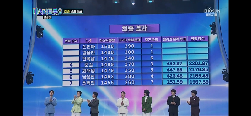 한류스타상이 공개되고 이어서 최종 미스터 트롯3 순위 결과가 공개 되었는데요~ 실시간 문자투표 점수까지 포함한 최종 순위는 7위 추혁진(총 1967.59점) / 6위 남승민(총 2165.48점) / 5위 최재명(2176.95점) / 4위 춘길(2201.87점) 순으로 이름을 올렸고,