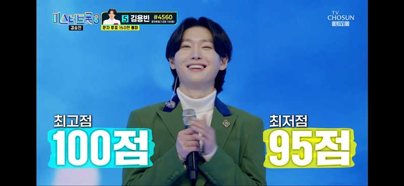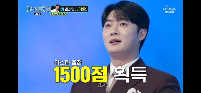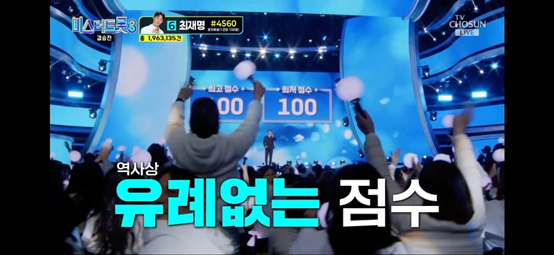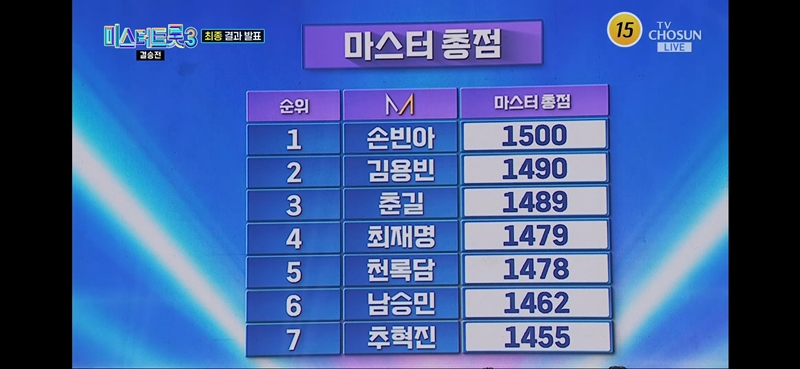 미스터 트롯이 현재 세 번째 시즌인데 역대 시즌에서 유례없는 점수를 받은 주인공으로 최저점까지 100점이 나왔으니 마스터 점수는 총 1500점을 획득한 거예요.