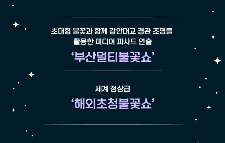 제19회 부산 불꽃축제는 초대형 불꽃과 함께 광안대교 경관 조명을 활용한 미디어 파사드를 연출했고, 세계 정상급의 해외 초청 불꽃쇼도 선보인 다고 하니까 벌써부터 기대되네요.