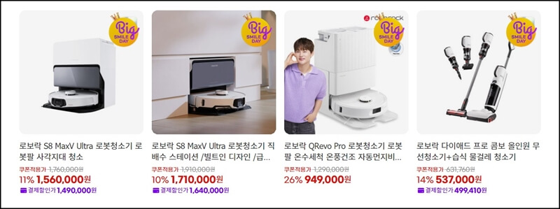 그리고 또하나, 매일진행되는 라이브 방송에 따라서 역대급 혜택을 받을 수 있는 오늘의 브랜드관에서는 삼성전자, LG전자 제품들뿐만 아니라 요즘 로봇청소기로 유명한 로보락 제품들도 만나볼 수 있어요.