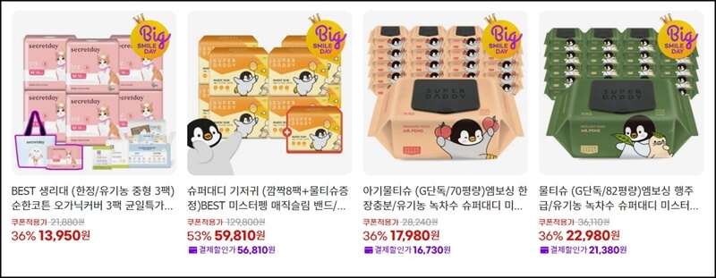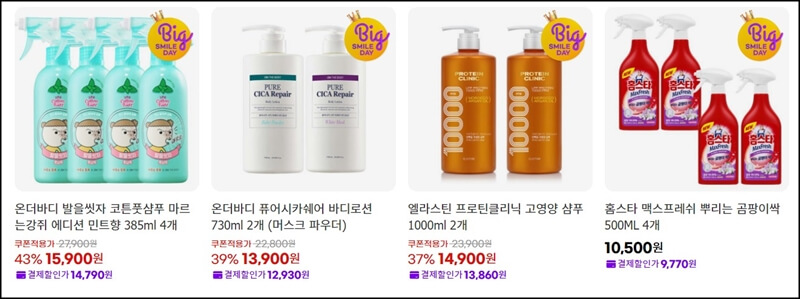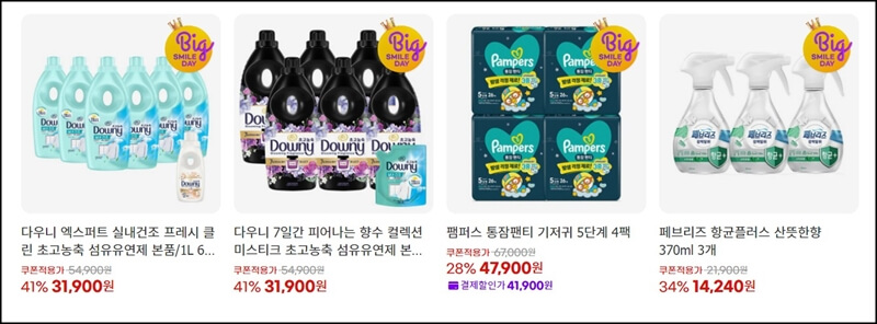 빅스마일데이에서 빠질 수 없는 게 생필품이기도 한데요~ 유한킴벌리에서도 다양한 제품들을 착한 가격에 구매할 수 있고, P&G 제품들도 최대 할인을 받아서 구매할수 있어요.