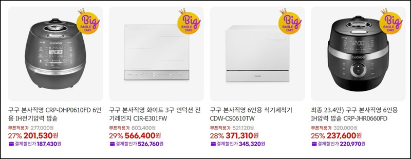 오직 지마켓과 옥션에서만 진행하는 빅스마일데이는 모든분들께 최대 30만 원을 할인받을 수 있는 10% 할인쿠폰을 제공하고 5% 브랜드 중복쿠폰과 7% 카드사 결제할인을 받을 수 있어요. 여기에 빅스마일데이 특가 상품에서 가전 및 리빙, 유아동 제품들을 만나볼 수 있는데 빅스마일데이 특가 상품들은 한정수량, 특별기획세트, 마감할인 위주로 매일 새로운 상품이 공개돼요.