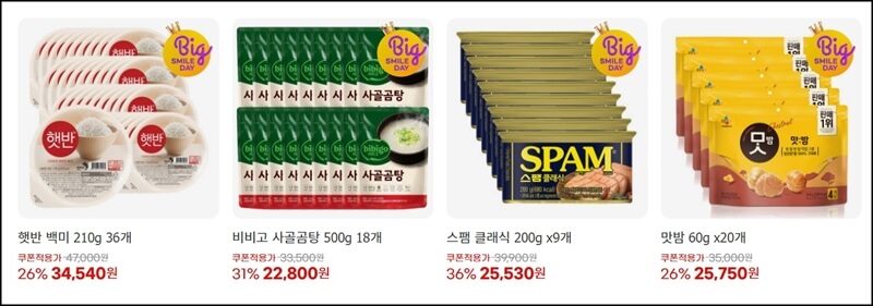 생각보다 햇반이나 스팸은 가격이 비싼 편이데 CJ제일제당도 빅스마일데이 특가 브랜드에 입점되어 있으니까 여러 판매처에서 가격비교를 해보고 구매하시면 좋을 것 같아요.