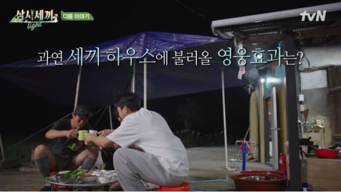 모든 출연진들이 좋았지만 유독 차승원과 유해진이 서로 주고받는 티키타카가 많은 사랑을 받았고, 그래서 그런지 이 두사람이 출연했던 시리즈가 시청률이 조금 더 높긴 하더라고요. 모든 음식을 뚝딱 만들어내는 차승원과 배려심 많은 유해진이 그려내는 모습이 보기만 해도 웃음 짓게 만들었었는데 이번 삼시세끼 라이트에서도 역시나 그대로더라고요.