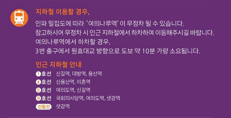 • 9호선 : 국회의사당역, 여의도역, 샛강역