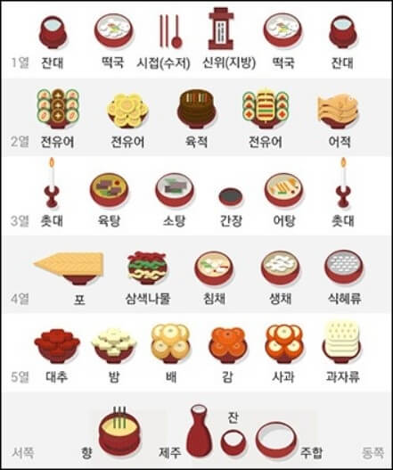5열에는 조율이시에 따라서 왼쪽부터 대추, 밤, 감(곶감), 사과, 약과, 한과 순으로 올리고 홍동백서에 따라서 붉은 과일을 동쪽, 흰색 과일은 서쪽에 올립니다.