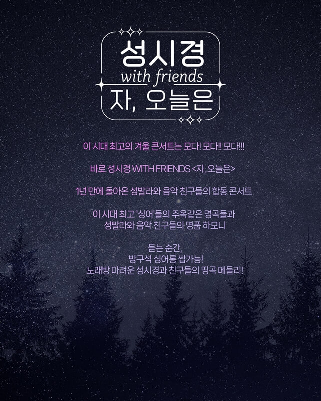 그간 쉽게 볼 수 없었던 성시경과의 듀엣 무대를 선사하는 성시경 위드프렌즈 콘서트는 오는 28일 오후 8시 35분에 SBS에서 방영되니까 콘서트에 못 가서 아쉬웠던 분들은 꼭! 시청해 보세요.
