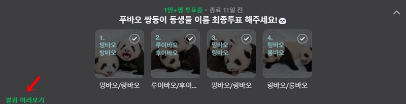 쌍둥이 판다 이름 투표 go를 누르면 푸바오와 쌍둥이 동생들이라는 이름의 오픈톡방으로 연결이 되는데요~ 상단에있는 투표 중으로 표시되어 있는 오른쪽의 화살표를 누르고
