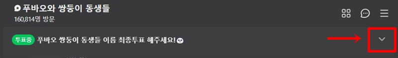 쌍둥이 판다 이름 투표 go를 누르면 푸바오와 쌍둥이 동생들이라는 이름의 오픈톡방으로 연결이 되는데요~ 상단에있는 투표 중으로 표시되어 있는 오른쪽의 화살표를 누르고