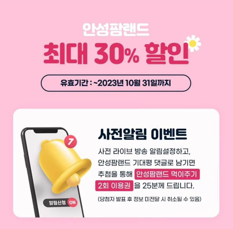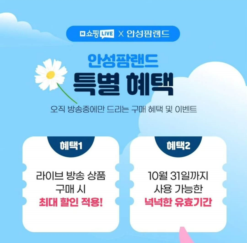 안성 팜랜드 코스모스 축제는 9월 2일부터 시작되었는데요~ 9월 14일 오전 11시에 시작되는 네이버 쇼핑라이브 방송을 통해서 방송 상품을 구매하면 최대 30% 할인을 적용 받을수 있습니다.
