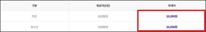 종일권은 어른, 청소년 상관없이 26,000원으로 입장권을 구매할 수 있고, 4시간 이용권은 어른, 청소년 구분없이 20,000원으로 입장권을 구매할수 있어요.