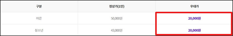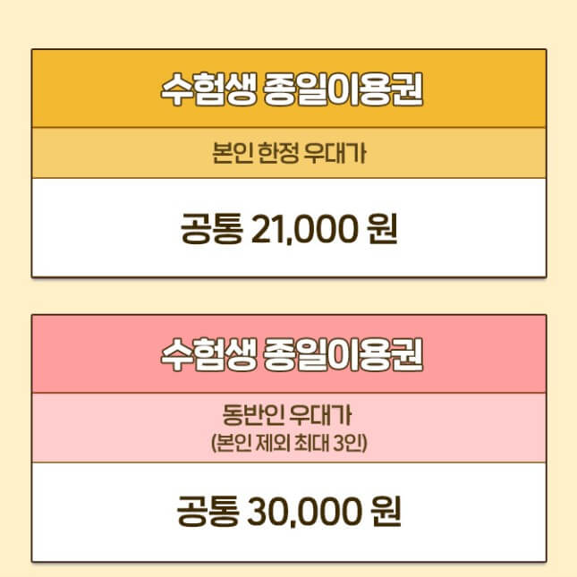 에버랜드 수험생 할인 이벤트 가격은 본인 한정으로 종일 이용권 구매 시 21,000원에 구매할 수있고, 동반인 우대가는 본인 제외 최대 3인으로 30,000원에 구매할수 있어요.