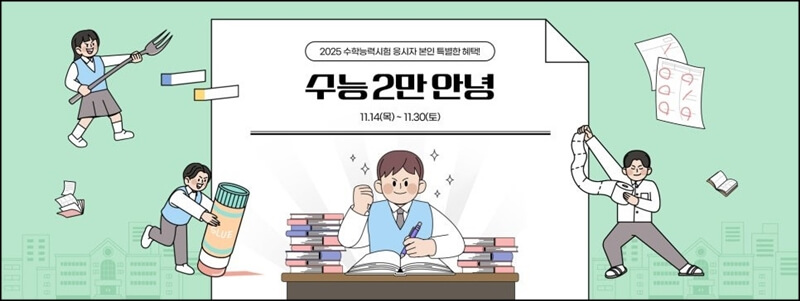 롯데월드 수험생 할인 이벤트인 수능 2만 안녕은 11월 14일부터 11월 30일(토)까지 진행되는데요~ 롯데월드 수험생 할인 이벤트는 에버랜드 수험생 할인 이벤트와 달리 2025 수학능력시험 응시자 본인만 대상이 돼요.