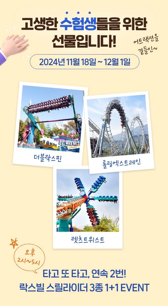 그리고 또 하나의 에버랜드 수험생 할인 이벤트는 에버랜드에서 인기가 많은 더블락스핀, 롤링엑스트레인, 렛츠 트위스트를 연속으로 2번 탈 수 있는 이벤트도 진행한다고 하니까 해당 이벤트기간과 시간을 참고해서 방문하면 더 재밌게 즐길 수 있지 않을까 싶어요.