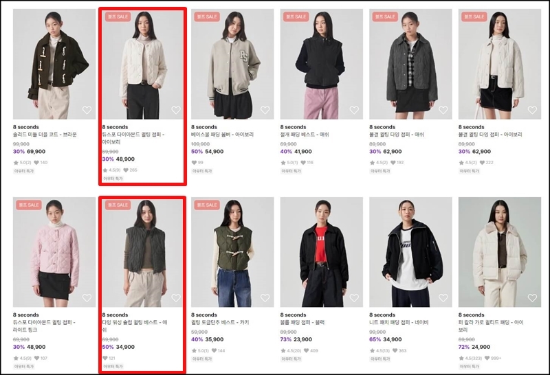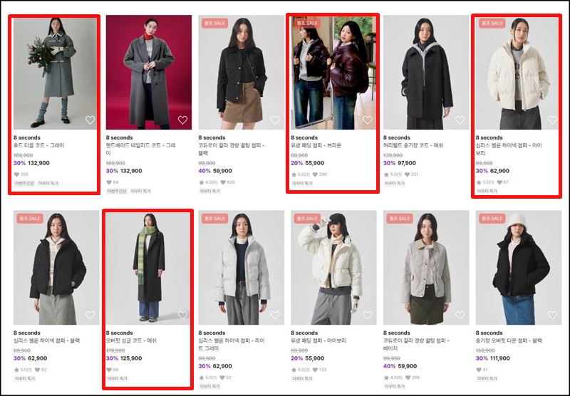많은 제품들중에서도 제가 추천하고 싶은 상품들은 빨간 테두리로 표시해 놨는데 이번 신상품으로 출시된 후드 더플코트가 너무 예쁘더라고요. 그리고 노스페이스 눕시와 비슷하게 출시된 유광 패딩 점퍼 브라운색도 5만 원대에 구매할 수 있어서 부담 없이 막 입고 다닐 수 있어 좋은 것 같고요.