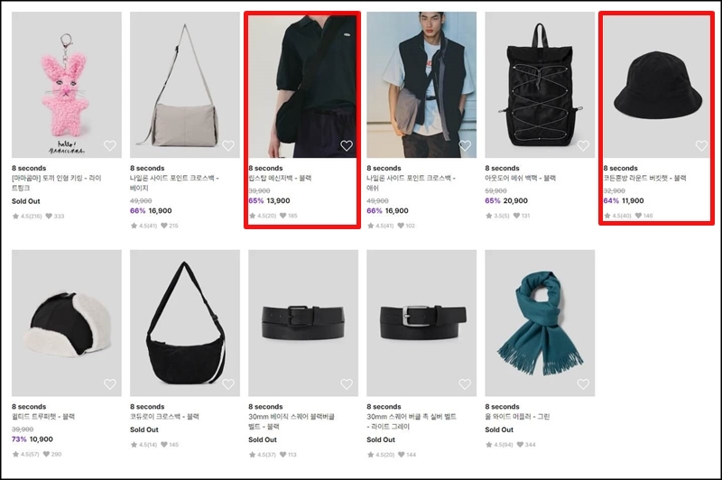 저는 작년 겨울에 유니클로에서 메신저백을 구매해서 아직까지도 잘 착용하고 다니는데요~ 에잇 세컨즈에서도 메신저백이 보일 길래 냉큼 추천상품에 넣어봤고, 버킷햇도 추천상품에 넣어봤어요.