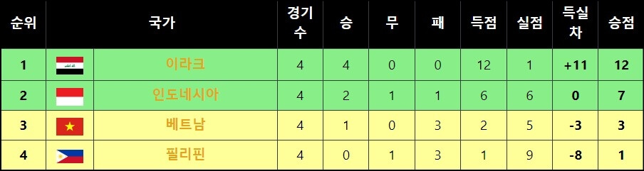 이라크, 인도네시아, 베트남, 필리핀이 속해있는 F조에서는 승점 12점을 달리고 있는 이라크가 1위에 올라있는데요~ 이라크는 필리핀과의 4차전 경기에서 0대 5라는 대승을 거두면서 3차 예선 진출을 확정했어요. 그리고 이와 동시에 아시안컵 본선 진출도 자동으로 확정이 됐죠~